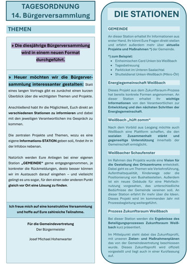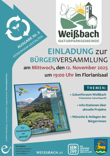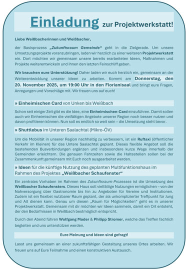 Informiert wurde unter anderem über das „Weißbacher Schaufenster“, das Sozialprojekt „Weißbach hüft zomm“, die Energiegemeinschaft Weißbach, den Zukunftsraum Weißbach sowie weitere Vorhaben aus der Gemeinde und der Region.